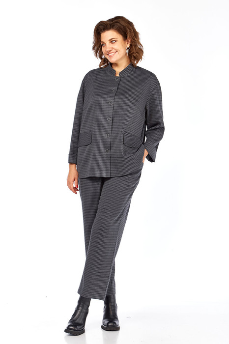 Костюм брючный, изготовлен из костюмной ткани. Жакет прямого силуэта. Горловина обработана воротником-стойкой, застежка центрально-бортовая на петли и пуговицы. На полочке нагрудные вытачки, обработаны карманы. Рукава спущенные, длинные. Брюки свободного кроя, пояс притачной, сзади на резинке. Застежка на тесьму-молнию и петлю пуговицу. На передних частях брюк в подрезных деталях обработаны карманы.