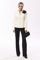 Костюм брючный двухпредметный, повседневно-нарядный, выполнен из ткани с мерцающим эффектом. Состоит из блузы и брюк. Блуза свободного силуэта. Воротник рубашечного типа, застежка центральная на петли и пуговицы. С левой стороны настрочной карман. Спинка с притачной кокеткой и встречной складкой. Рукава спущенные, по низу складки и широкая притачная манжета. Низ блузы фигурный. Брюки прямые, пояс притачной на резинке. В брюках обработаны карманы.