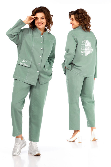 Костюм брючный двухпредметный, состоит из жакета и брюк, выполнен из ткани костюмно-плательного ассортимента. Жакет прямого силуэта. Горловина обработана воротником — стойка, застежка центрально — бортовая на петли и пробивные пуговицы. Перед с кокетками и рельефами выходящими из них. Имеются прорезные карманы с клапаном. Спинка на кокетке. Рукава рубашечного типа. Жакет дополнен печатью. Брюки свободного силуэта слегка заужены к низу. Пояс притачной, частично на эластичной тесьме, с застежкой на петлю и пробивную пуговицу. По переду обработаны карманы с листочкой и подрезным бочком. Вдоль швов костюма проходят контрастные строчки из отделочных ниток.