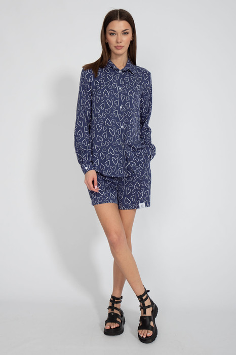Костюм. Рубашка вискоза полуприлегающего силуэта с втачными рукавами, удлиненная по спинке. Обработка низа рубашки в форме овала. Шорты вискоза свободного кроя. Карманы в боковых швах.