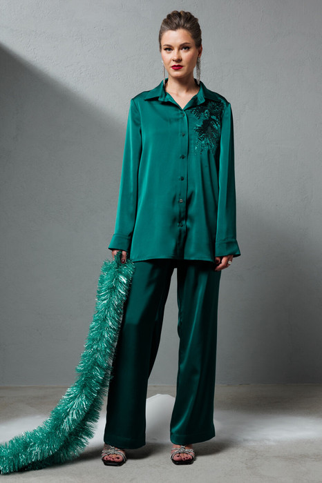 Атласный брючный комплект. Комплект состоит из блузки свободного кроя и брюк на резинке. На блузке выполнена дизайнерская вышивка пайетками. Ткань плотная, струящаяся. Длина блузки- 73 см, длина брюк - 107 см.