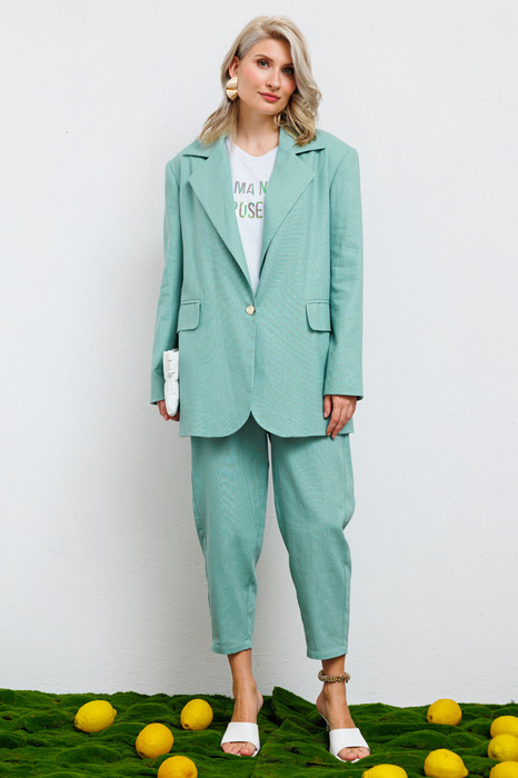 Комплект состоит из жакета и брюк. Жакет оверсайз свободного кроя. Модель в мужском стиле с чуть расширенными плечами. Карман с клапаном. Жакет выполнен из плотного льна на хлопковой подкладке. Длина - 78 см. Брюки длиной «по косточку» легко впишутся в гардероб и останутся в нем на много сезонов. Пояс с резинкой для идеальной посадки по талии. Сзади расположены накладные карманы с клапаном.  Длина - 95 см.