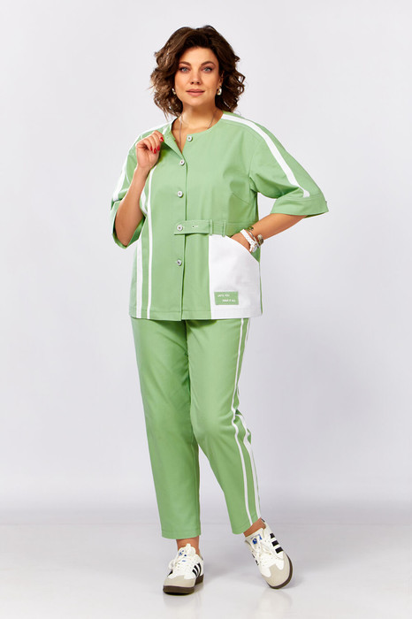 Супер модный костюм в стиле спорт шик из легкого хлопкового джинса, идеален для летнего отдыха и городских прогулок . Яркий акцент костюму придает асимметричный карман на полочке с декоративными элементами имитации пояса и отделка из киперной белой тесьмы по рукаву полочке , спинке и брюкам . Блузон свободного кроя , без воротника , застежка на джинсовые пуговицы. Брюки средней посадки , заужены к низу , без застежки , на резинке, с карманами в боковых швах.
