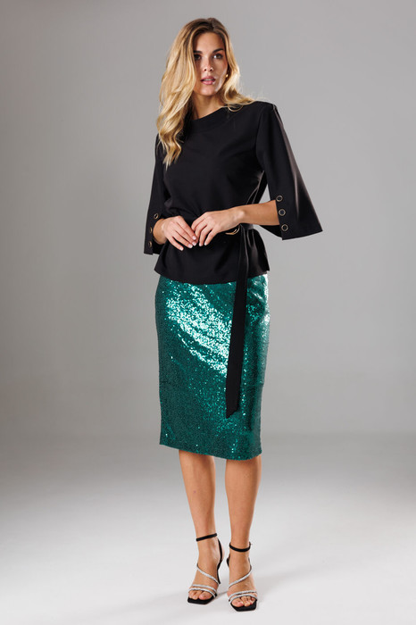 Элегантный и тем временем нарядный союз, состоящий из блузона с поясом, который подчеркивает талию, и слегка зауженной к низу юбки в пайетки.
