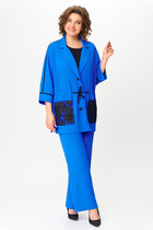 Блузон свободного силуэта со спущенной проймой и укороченным втачным рукавом длиной 26 см. По центру изделия расположен декоративный элемент прямоугольной формы: с изнаночной стороны настрочен прямоугольник из полотна с пайетками. С лицевой стороны произведены горизонтальные прорези, через которые просматривается полотно с пайетками. Горловина округлой формы на притачной планке высотой 3 см. Длина изделия по спинке 67 см.