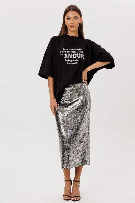 Юбка из эффектного трикотажного полотна с пайетками на подкладке прямого силуэта, чуть зауженная к низу. В среднем шве размещена потайная молния и открытый разрез. На линии талии размещены классические вытачки. Пояс текстильный внутренний, обтачной. Длина юбки по среднему шву 80 см. Высота разреза 33 см.