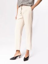 Брюки комплекта созданы в свободном стиле. Силуэт брюк к низу изделия имеет расклешение. В пояс брюк по спинке вставлена эластичная тесьма, шириной 3 см. Спереди пояс фиксируется горизонтально на петли/пуговицы и вертикальную закрытую клапан-молнию (гульфик). При желании в пояс можно вставить ремень, так как имеются шлевочные держатели. В боковых швах: карманы с наклонным входом, на поясной линии талии переда расположена неглубокая складка для свободы движения, на задних полотнищах линии талии-вытачки. Длина брюк по боковому шву 108 см (без учета высоты пояса).