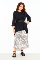 Брюки комплекта созданы в свободном стиле. Силуэт брюк к низу изделия имеет расклешение. В пояс брюк по спинке вставлена эластичная тесьма, шириной 3 см. Спереди пояс фиксируется горизонтально на петли/пуговицы и вертикальную закрытую клапан-молнию (гульфик). При желании в пояс можно вставить ремень, так как имеются шлевочные держатели. В боковых швах: карманы с наклонным входом, на поясной линии талии переда расположена неглубокая складка для свободы движения, на задних полотнищах линии талии-вытачки. Длина брюк по боковому шву 108 см (без учета высоты пояса).