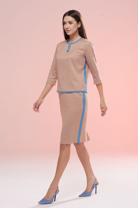 Шикарный юбочный комплект полуприлегающего силуэта. По переду блузона расположены нагрудные вытачки, горизонтальные притачные контрастные планки по округлой горловине и низу изделия. По центру полочки изделия расположена контрастная декоративная деталь-планка, которая закреплена несколькими пуговицами. Спинка изделия имеет таливые вытачки и вытачки по горловине. В среднем шве расположена длинная потайная молния и миниатюрный разрез 4.5 см. В боковые швы блузона притачены контрастные планки, шириной 2.7 см. Длина изделия по спинке р.44-48-53,5 см, р.50-52-54.5 см. Рукав одношовный, длиной Юбка комплекта на кокетке, с функциональными наклонными карманами. На спинке изделия расположена молния в среднем шве и открытый разрез. В боковых швах - контрастные вставки, шириной 2.7 см. Пояс обработан обтачкой. Юбка на подкладке. Длина изделия: р. 44-48-59.5 см,р.50-52-62 см. *фурнитура может отличаться от представленной на рекламном фотоматериале) Особые рекомендации: рекомендуется холодная деликатная ручная стирка, без использования отбеливающих СМС, без интенсивного трения. Сушка в вертикальном положении. ВТО с минимальным паром.