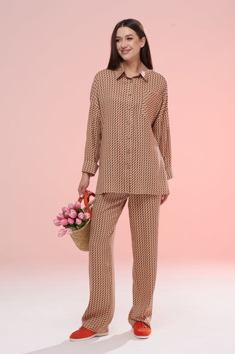 Стильный комплект, состоящий из блузы рубашечного силуэта и свободных брюк. Блуза прямого свободного силуэта с рубашечным воротником на стойке, спущенной линии плеча и втачным рукавом на манжете с отворотом. В боковых швах расположены открытые разрезы, высотой 11 см. На левой стороне полочки находится накладной карман. Застежка петли-пуговицы расположена на фронтальной вертикальной планке. Длина изделия по спинке-73 см. Длина рукава от плечевой точки горловины-61 см(положение манжеты с отворотом). Брюки комплекта прямого силуэта. В боковых швах расположены внутренние наклонные карманы. Пояс со вставленной эластичной тесьмой, шириной 3 см. и дополнительным шнуром-кулисой для четкой фиксации объема талии. Длина брюк по боковому шву-112 см. Рост: 164-174