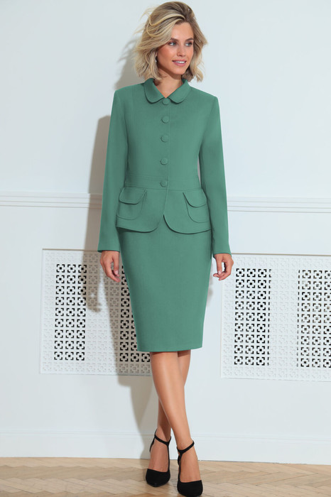 Комплект, состоящий из жакета и юбки. Жакет полуприлегающего силуэта на подкладке с рельефами по переду и спинке, с отрезным поясом по талии и накладными карманами с клапаном. Рукав втачной двухшовный длинный, воротник стояче-отложной. Застежка центральная бортовая на обтяжные пуговицы. Юбка на подкладке, зауженная к низу с притачным поясом и на резинке в размерах 50-60. Застежка в юбке на потайную тесьму-молнию в среднем шве заднего полотнища и шлицей.