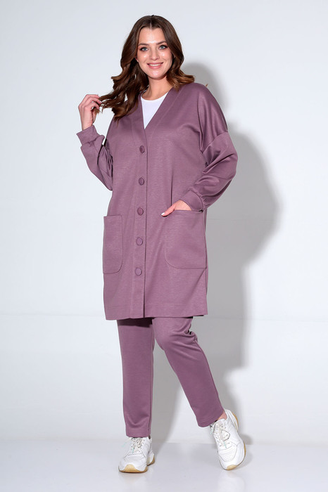 Кардиган прямого силуэта со спущенной линией плеча, низ рукава на притачной манжете. По переду кардигана накладные карманы на подкладке. Центральная застёжка на петли и пуговицы. Брюки заужены к низу. Верхний край брюк на притачном поясе с эластичной тесьмой, с потайным шнуром. В боковых швах карманы-«хулиганы».