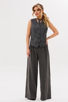 Комплект изготовлен из двух видов тканей. Жакет слегка приталенного силуэта с центральной бортовой застежкой на 3 петли и пуговицы. Воротник пиджачного типа с отложными лацканами. По переду обработаны прорезные карманы с листочкой. Рукава втачные двухшовные. Жакет на подкладке. Брюки к низу заужены, верхний срез брюк на притачном поясе, от середины передних половинок и по спинке вставлена резинка. По переду брюк имитация гульфика, по бокам карманы с наклонным входом.