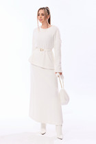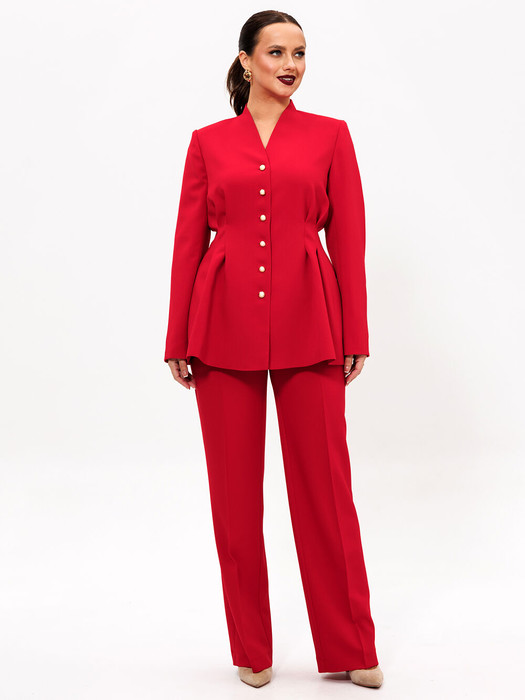 Жакет выполнен из костюмной ткани. Жакет Х-образного силуэта, длиной чуть ниже линии бёдер. Спереди центральная застежка на петли и пуговицы. По переду и спинке в области талии заложены складки. Спинка со средним швом. Воротник - цельнокроеная стойка. Рукав втачной двух шовный. Жакет на подкладке. Брюки прямого кроя. На передних половинках небольшая складка, переходящая в стрелку. Верхний срез брюк обработан притачным поясом, по бокам вставлена резинка, имеются шлёвки под ремень. Застёжка брюк по типу «гульфик». В боковых швах карманы «хулиганы». На задних половинках брюк вытачки.
