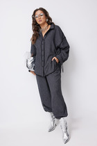 Брюки на поясе с резинкой, со вставками из контрастной ткани по боковым швам и разрезами в нижней части боковых швов.