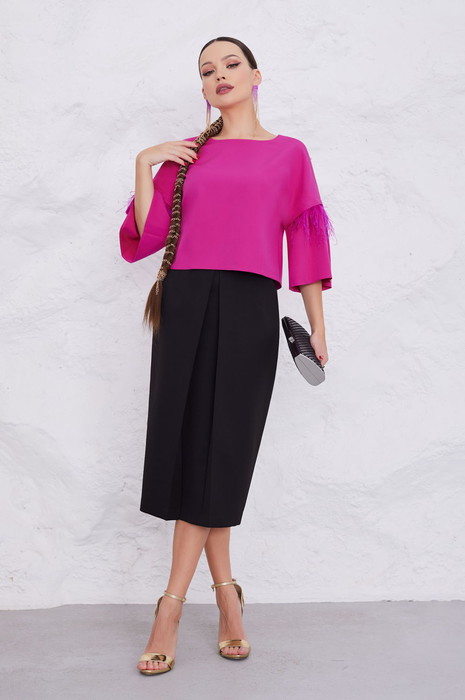Блуза со спущенной линией плеча. Рукава втачные с тесьмой. Тесьма с перьями съёмная. Спинка с потайной молнией в среднем шве.