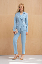 Жакет с V – образным вырезом горловины и двубортной застёжкой на петли и пуговицы. Изделие со съёмным дизайнерским воротником, который застёгивается спереди на пуговицы. Перед с карманами в нижней части. Спинка со средним швом и талиевыми вытачками. Рукава втачные. Изделие на подкладке.