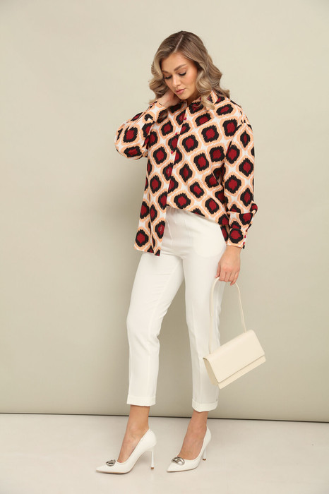 Комплект 2ка, состоящий из рубашки и брюк. Рубашка женская большого объема, прямого силуэта. На детали спинки расположена двойная кокетка, переходящая на деталь полочки. Под кокеткой на спинке встречная складка. Воротник рубашечный отложной на стойке. Застежка планка центральная на прорезные петли и пуговицы. Линия плеча спущенная, рукав рубашечный, длинный. В нижней части рукава заложены складки, заканчивается манжетой с двумя прорезными петлями и пуговицами. Низ блузки разноуровневый: спереди короче, сзади длиннее.  Зауженные брюки с подворотами по низу. Пояс на эластичной тесьме с кулисой и втянутым шнурком. Вход в карман фигурный, наклонный к боковому шву.