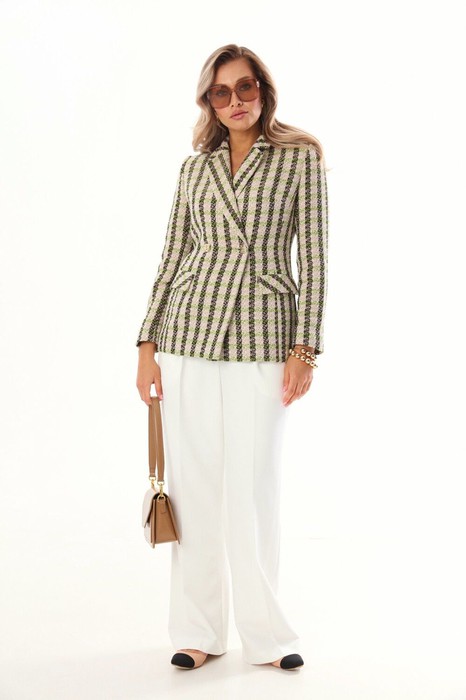 Комлект 2ка состоит из жакета и брюк. Жакет двубортный умеренного объёма из тёплой мягкой ткани. Застёжка на две пуговицы. По бокам расположены функциональные прорезные карманы с клапаном. Жакет на подкладке. Брюки широкого объема, прямого силуэта. На передних половинках брюк заутюжены стрелки, переходящие в складки по линии талии. На задних половинках также заутюжены стрелки. В боковых швах расположены карманы. Застежка-гульфик. Пояс отрезной, притачной. В задней части пояса вставлена эластичная тесьма (резинка). На пояс настрочены шлевки. Выступающая часть пояса застегивается на петлю и крючок.  Длина жакета по спинке 70-71 см. Длина брюк 110-114 см.