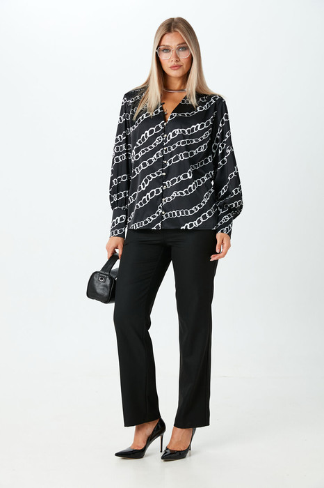 Комплект 2ка, состоящий из блузки и брюк. Блуза из тонкой ткани с атласным эффектом, свободного силуэта с V-образным вырезом. Это довольно глубокий вырез, который прекрасно подчёркивает декольте и линию шеи. Застежка на навесные петли и пуговицы. Рукава длинные объёмные втачные заканчиваются широкой манжетой с застёжкой на навесные петли с пуговицами. Брюки малого объема, прямого силуэта. На передних половинках с обеих сторон расположены под наклоном нефункциональные прорезные карманы в рамку. На задних половинках расположены вытачки. Пояс отрезной. На поясе расположены шлевки. Застежка брюк – гульфик на молнии, на поясе крючок. Длина блузки 67 см, длина брюк 110-112 см.