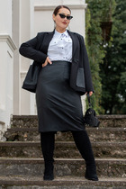 Комплект 2ка, состоящий из жакета и брюк. Жакет двубортный свободного объёма с застёжкой на пуговицы. По бокам расположены функциональные прорезные карманы с клапаном. Рукава жакета выполнены из отделочной ткани. Пере и спинка жакета на подкладке. Брюки прямого силуэта свободного кроя выполнены из ткани двух видов, по талии вставлена эластичная резинка.