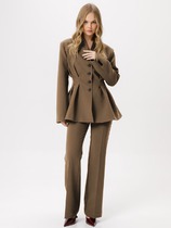 Комплект 2ка,состоящий из жакета и брюк. Жакет двубортный свободного обёма без воротника с застёжкой на кнопки. По переду расположены карманы с клапаном. Брюки свободного прилегания по бедрам и зауженные к низу. Пояс на эластичной тесьме с кулисой и втянутым шнурком. Вход в карман фигурный, наклонный к боковому шву.