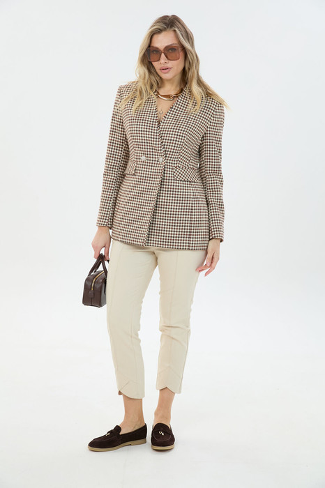 Комплект 2ка состоит из жакета и брюк. Двубортный жакет полуприлегающего силуэта с застёжкой на две пуговицы. Нагрудные вытачки на полочках расположены вертикально и совмещены с талиевыми, заканчиваются входом в карман. Карманы прорезные, в рамку с клапаном. Спинка имеет плечевые вытачки, средний шов со шлицей. Воротник – стойка переходит в край борта, имеющий V-образную форму. Застежка на прорезные петли и пуговицы. Жакет полностью обработан притачной подкладкой. Брюки зауженные к низу, длинной 7/8. Пояс брюк на эластичной тесьме с кулиской и декоративными шнурами-завязками. Вход в карман фигурный, наклонный к боковому шву. Низ брючин по переду имеет фигурный подрез.