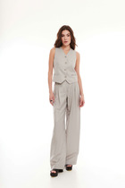 Костюм 2ка, состоящий из жакета и брюк. Жакет двубортный умеренного объёма приталенного силуэта с застёжкой на петли и пуговицы. По бокам расположены функциональные прорезные карманы с клапаном. Жакет на подкладке. Брюки умеренного объема, прямого силуэта. На передних половинках брюк заутюжены стрелки, переходящие в складки по линии талии. На задних половинках также заутюжены стрелки. По бокам расположены функциональные карманы. Застежка-гульфик. Пояс отрезной, притачной. На пояс настрочены шлевки. Пояс застегивается на петлю и крючок.