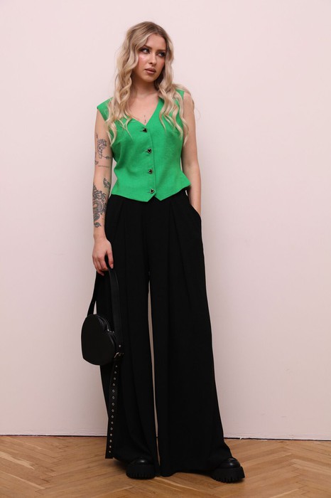 Комплект 2ка, состоящий их жилета и брюк. Жилет прилегающего силуэта. На полочках нагрудные вытачки переведены в рельефы. На спинке плечевые вытачки и рельефы. В рельефах, на уровне талии два хлястика с застежкой на полукольца. По низу детали спинки фигурный вырез. Жилет на подкладке. Застежка центральная на четыре петли и пуговицы. Брюки широкого объема. По центру переда заложены две широкие встречные складки на каждой половинке. В боковых швах расположены карманы с наклонным входом. Талия на резинке.