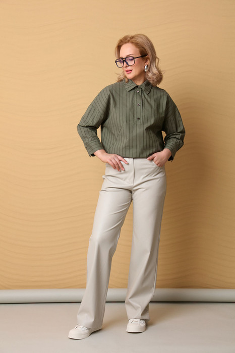 Комплект 2-ка, состоящий из блузки и брюк. Блузка свободного объёма, слегка зауженная к низу,с отложным воротником. Рукава 3/4. По переду застёжка планка на пуговицах.                                                                                                                                            Прямые брюки из мягкой экокожи с вискозной мягкой изнанкой, очень приятной к телу. По переду и сзади расположены карманы по принципу джинсовых брюк. Застёжка на молнию и пуговицу.        Рост модели 170, размер 48. СОВЕТ ОТ СТИЛИСТА: на работу из обуви отлично подойдут лоферы или босоножки с закрытым мысом на устойчивом каблуке средней высоты (в стиле Шанель).Для образа "выходного дня" сделайте выбор в пользу кроссовок или кед и возьмите объемную сумку.