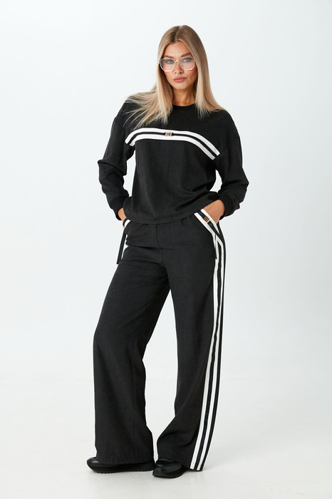 Костюм 2ка в стиле спортшик, состоящий из джемпера и брюк. Джемпер свободного объёма с декором по переду. Горловина джемпера и манжеты выполнены из довязов. Брюки свободного кроя от бедра. Талия брюк на резинке, по переду и сзади расположены карманы,дополненные декором. Комплект из мягкой не толстой ткани с эффектом "велюр". Длина джемпера 59-60 см , длина брюк 115-116 см.
