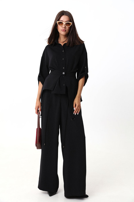 Костюм, состоящий из рубашки и брюк.  Рубашка на пуговицах объёмного силуэта. Рукава дополнены шлейкой с застёжкой на пуговицу для сборки.  Брюки широкого объема, прямого силуэта.