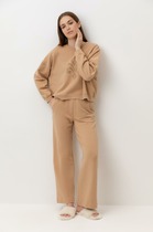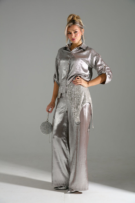 Костюм 2ка, состоящий из рубашки и брюк. Рубашка на пуговицах объёмного силуэта. Рукава дополнены шлейкой с застёжкой на пуговицу для сборки. Брюки широкого объема, прямого силуэта.