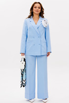 Жакет свободного кроя на подкладке, выполнен из текстильной ткани. По переду воротник-стойка, застёжка двубортная на пуговицы, накладные карманы и клапаны. По спинке средний шов, переходящий в шлицу, рельефы. Рукав втачной. К жакету прилагается съёмный пояс.