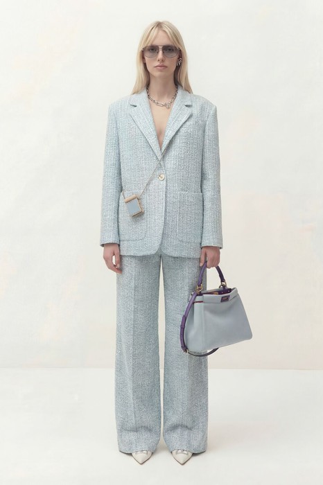Комплект состоит из жакета и брюк. Жакет свободного кроя прямого силуэта на подкладке. Рукав втачной длинный, шлица по локтевому шву. Воротник пиджачного кроя, застежка однобортная на петли и пуговицы, по бокам накладные карманы. По спинке средний шов и рельефы. Брюки прямого силуэта с завышенной линией талии и цельнокроеным поясом, по бокам прорезные карманы. Застёжка на задней половине брюк по линии сидения. По переду брюк от линии пояса вертикальные защипы.