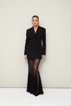 Жакет полуприлегающего силуэта из трикотажного полотна. Горловина округлая по центру застежка на петли и пуговицы. Рукав втачной короткий. По переду талиевые вытачки и накладные карманы, на спинке – талиевые вытачки. Жакет на подкладке. Обращаем ваше внимание, что фурнитура может отличаться от фото.