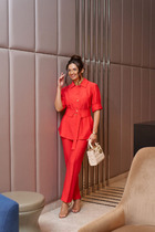 Джемпер из  трикотажного полотна, свободного кроя, удлиненный, со спущенной линией плеча.  С  круглым вырезом горловины, с планкой из кашкорсе. С изнаночной стороны по спинке на горловине настрочена  декоративная тесьма.  По переду  декор в виде нашивки. Обращаем Ваше внимание, что декор может незначительно отличаться от фото.  Рукав выполнен из кружевной ткани, по низу рукава манжета из кашкорсе. Джемпер с поясом из кашкорсе.