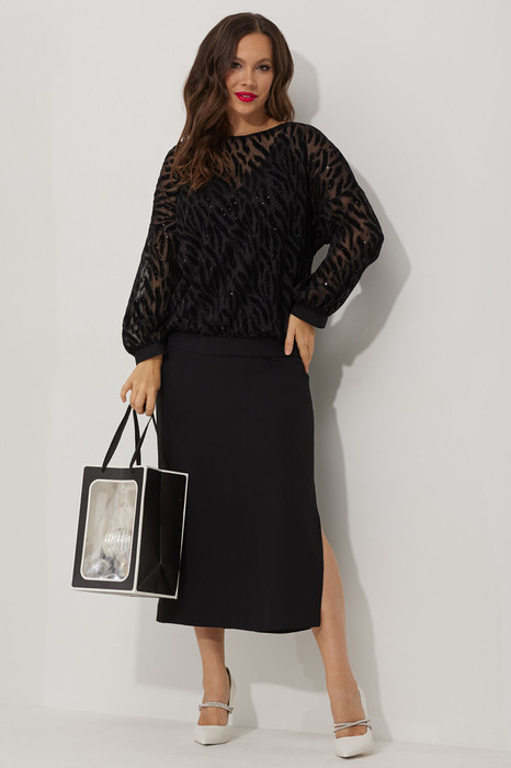 Нарядный комплект  из блузы топа и брюк. Блуза свободного кроя, рукав спущен, дополнен по низу притачной манжетой. Выполнена из полупрозрачной ткани с набивным бархатным дизайном. Топ прямого кроя на тонких бретелях с регуляцией. Юбка  миди классического кроя на подкладке. По левому боковому шву расположена застежка на потайную молнию и разрез. Длина блузы от плечевого шва 66 см. Длина рукава 57см. Длина топа 60 см.  Длина юбки по боковому шву 88 см.