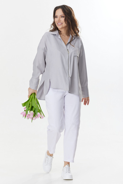 Стильный комплект из блузы и брюк. Блуза свободного оригинального кроя с центральной застежкой на молнию. Выполнена из приятного к телу поливискозного полотна. Воротник отложной. Рукав втачной, слегка спущен, дополнен притачной манжетой. Брюки прямого классического кроя, слегка заужены книзу, с притачным поясом. Выполнены из джинсовой ткани. Посадка средняя. Застежка на молнию и пришивную пуговицу. Дополнены боковыми и задними карманами. Длина блузы от плечевого шва 70см. Длина рукава 60см. Длина брюк по боковому шву 92 см.