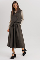 Элегантный комплект из кардигана и платья. Выполнен из фактурного трикотажного полотна средней плотности(лапша). Отлично держит форму и скрывает недостатки. Кардиган свободного кроя с центральной застежкой на пришивные кнопки. Рукав втачной, слегка спущен. Воздушный фатиновый эффект кардигану придает объемно наложенная текстильная сетка, закрепленная по горловине, в манжетах рукава, а так же по низу кардигана. Стыковочные швы обработаны декоративной тесьмой. Низ рукава и кардигана обработан довязом, выполненным из основной ткани. Платье миди прямого кроя с боковым разрезом. Рукав втачной, длина 3/4. Горловина обработана довязом из основной ткани. Длина кардигана от плечевого шва 60см. Длина рукава 60см. Длина платья от плечевого шва 125см. Длина рукава 43см.