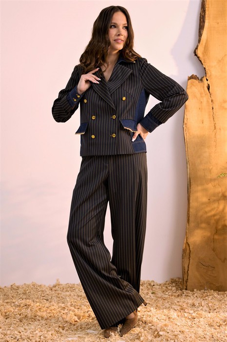 Стильный компект из жакета и брюк. Двубортный жакет выполнен из костюмной ткани в комбинации с темно-синим джинсом. Жакет на подкладке с застежкой на пришивные пуговицы. Рукав втачной, дополнен манжетой из джинса.  Воротник отложной. Брюки классического прямого кроя с притачным поясом, выполненным из джинса, дополненным эластичной тесьмой. Посадка средняя. Дополнены удобными боковыми карманами. Застежка гульфик на молнию и пришивную пуговицу. Брюки выполнены из комфортной костюмной ткани. Длина жакета от плечевого шва 58см. Длина рукава 60см. Длина брюк по боковому шву 104см.