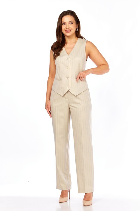 Комплект женский , состоящий из жилета и брюк. Жилет полуприлегающего силуэта на подкладке с застёжкой на петли и пуговицы. Спинка со средним швом, на уровне алии хлятик с застёжкой на 2 пуговицы. По переду вытачки и прорезной карман с листочкой. Брюки классические . Спереди застёжка на молнию и пуговицу.Сзади вытачки. В боковых швах карманы с отрезным бочком.Пояс с резинкой по спинке, дополнен шлёвками.