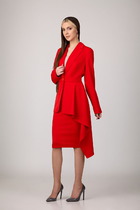 Универсальный и удобный женский брючный костюм из мягкой костюмной ткани предназначен для повседневной носки и торжественных мероприятий. Жакет укороченный с цельнокроенным рукавом длиной 7/8 с патой, закрепленной пуговицей. Перед жакета с ассиметричной косой застежкой на навесные петли с пуговицами. Брюки-шаровары длиной 7/8, по верху с поясом на резинке. Имеются боковые карманы в швах. Также по талии( переда) двухвстречные складки, по низу передних и задних половинок односторонние складки, придающие пышность брюкам. Комплект смело сочетается с любой обувью. Длина жакета по спинке 56 см+-1 см, длина рукава от горловины 50 см ± 1см. Длина брюк по боковому шву 99 см+-1см, по шаговому 66 см+-1см. Изделие подойдет на рост 170 см.