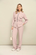 Стильный комплект, состоит из бомбера, майки и брюк. Майка выполнена из вискозы, хорошо тянется и приятная к телу. Горловина округлой формы, окантована, рукав укороченный. Бомбер выполнен из летней ткани, льна-вишера, имеет приятную фактуру, комфортен в ношении. Горловина округлой формы, на обтачке, застежка на кнопки, лиф изделия с отрезной кокеткой, декорированной бусинами. Также на полочке обработаны прорезные карманы с листочкой. Спинка свободного покроя, по низу изделие обработано планкой с резинкой. Рукав втачной, длинный, по низу на манжете, с декором в виде паты, застегивается на кнопку. Брюки-палаццо выполнены из льна-вишера, с застежкой на молнию, верхний срез обработан притачным поясом, с застежкой на пуговицу. На передних полотнищах обработаны карманы в боковых швах, по верху заложены односторонние складки. На заднем полотнище брюк обработаны вытачки, низ с широкой подгибкой. Стильный комплект с эффектным декором и фурнитурой, отличный выбор для летнего гардероба!