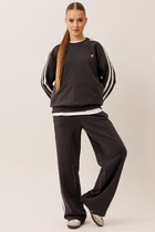 Женский комплект, состоит из бомбера и брюк, свободного покроя, выполнен из трикотажного полотна с эффектом «штрукс». Бомбер свободного покроя, с застежкой по переду на кнопки, горловина V-образной формы, отделана довязом контрастного цвета. Также на полочке обработаны прорезные карманы с листочкой, по низу бомбера втачен довяз контрастного цвета. Рукав втачной, длинный, из основной ткани, по низу на манжете. Брюки прямого покроя, на притачном поясе, выполнены из трикотажного полотна с эффектом «штрукс». Застежка по переду на молнию, также по переду брюк обработаны карманы в боковых швах, на заднем полотнище брюк обработана кокетка. Стильный и удобный комплект в спортивном стиле то, что нужно на каждый день!