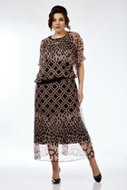 Комплект состоит из удлиненной туники и брюк. Туника из мягкого  теплого трикотажного полотна со швом по переду и удлиненым разрезом. Линия плеча спушенна, рукав одношовный, воротник стойка. Брюки прямые от линии калена, застежкой в боковом шве на потайную молнию. Длина туники 115 см, длина рукава от плеча 66 см. длина брюк 108 см