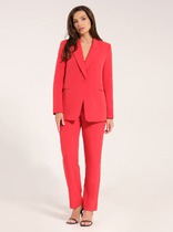 Комплект двухпредметный состоит из жакета и брюк. Жакет на подкладке с центральной застежкой на 2 петли и пуговицы с воротником пиджачного типа. По переду функциональными карманами с клапаном. Спинка с рельефом выходящим из проймы и средним швом. Рукав втачной с декоративным швом по середине рукава переходящим в шлицу. Шлица декорирована 5-ю пуговицами. Брюки прямые от бедра с боковыми карманами. Пояс на резинке по спинке. Костюм двойка отлично подойдет для офиса, для праздника, на каждый день для прогулок.