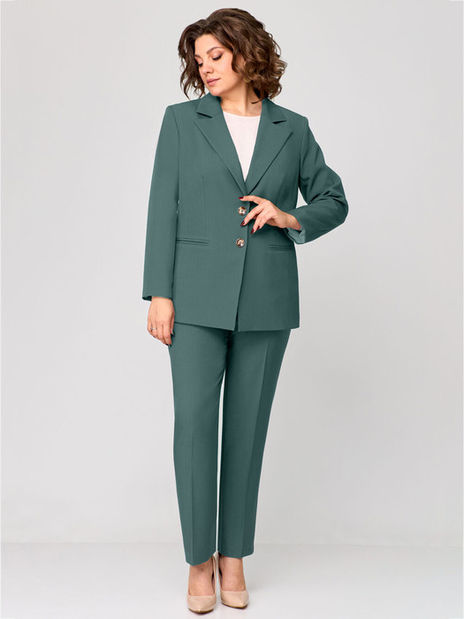 Костюм женский, двухпредметный жакет и брюки. Жакет на подкладке классического стиля. Воротник отложной с лацканами. Карманы прорезные в рамке, функциональные. Длина жакета по спинке с 48-50 размер 66 см, в размерах 52-56 – 71 см. Рукав втачной, двухшовный. Длина рукава – 59 см. Брюки прямые, заужены к низу. Длина брюк по боковому шву с поясом - 102 см. Брюки на поясе, по бокам резинка и косые карманы
