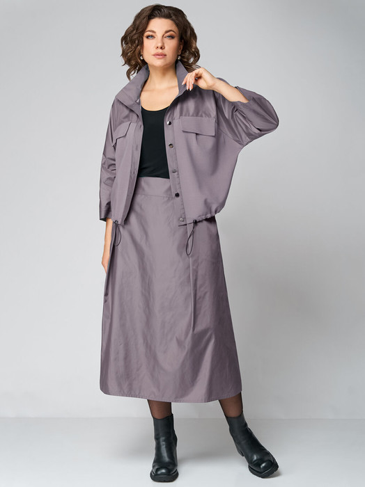 Жакет со спущенной линией плеча и цельнокроеным рукавом. По переду отрезная кокетка из плащевой ткани, воротник- стойка, рукава и планки. По переду настрочены нагрудные клапаны. Синка со средним швом. На левом рукаве о низу настрочена нашивка. Центральная застежка по планкам на 5 пуговиц и петель. Низ жакета можно регулировать с помощью эластичного шнура и фиксатора. Жакет без подкалки.