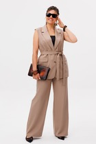 Костюм женский, состоит из блузы и брюк. Блуза прямого силуэта. Застежка центральная на 2 петли-пуговицы. воротник пиджачного типа. Блуза без карманов. Рукав внизу на пате, в боковых швах блузы - разрезы. Брюки прямые на резинке со шнурком, свободные, прямые, с боковыми карманами. Дополняет костюм съемный пояс.